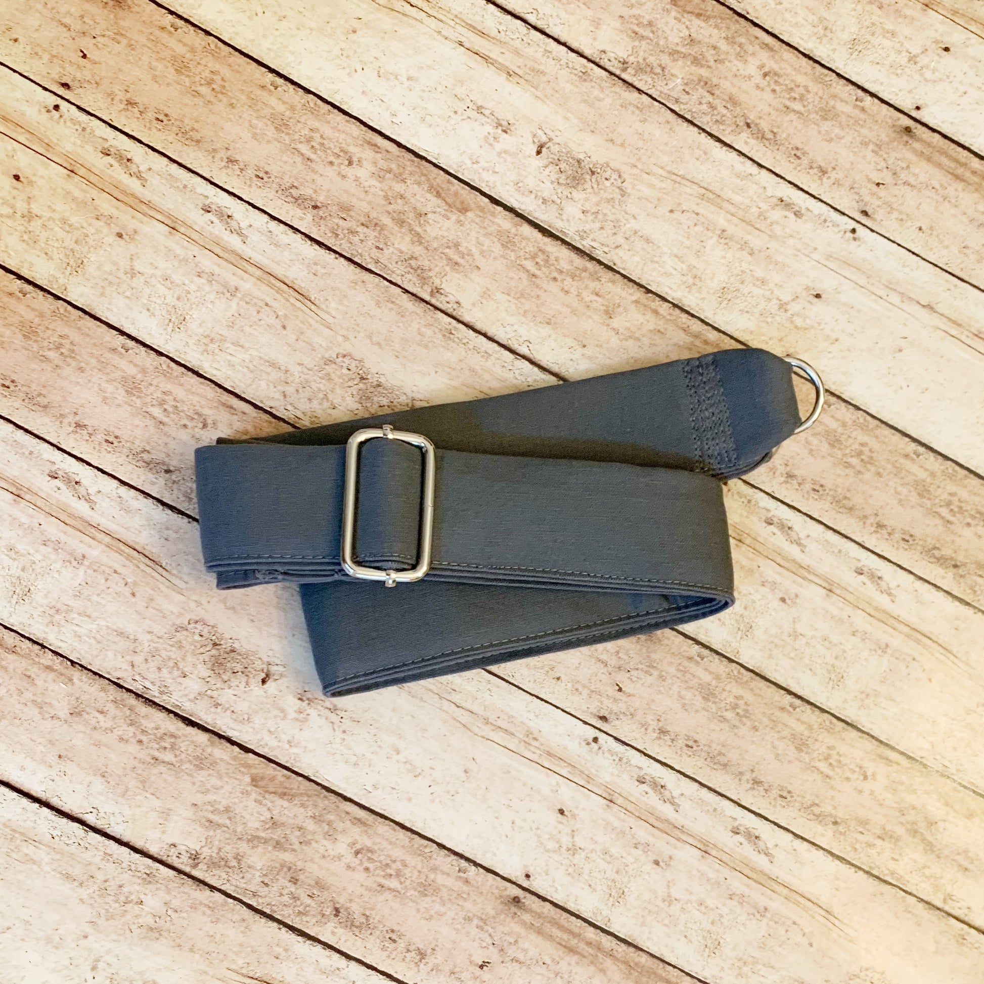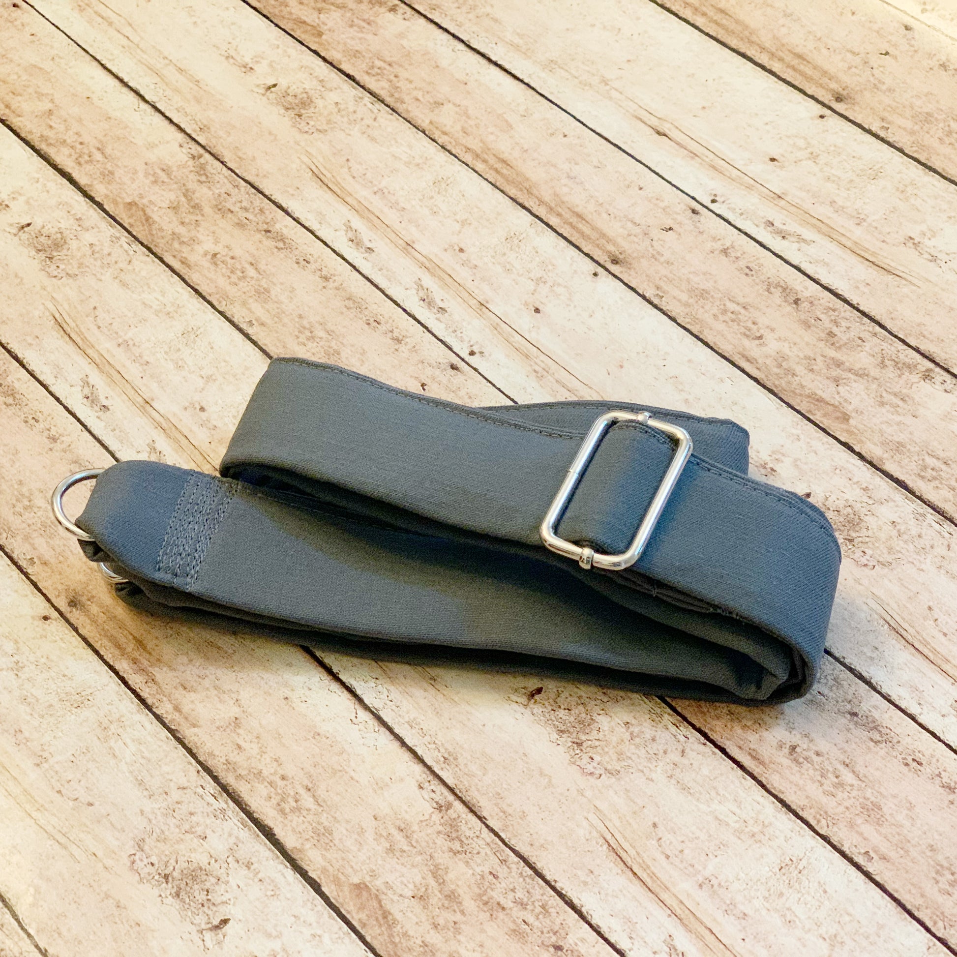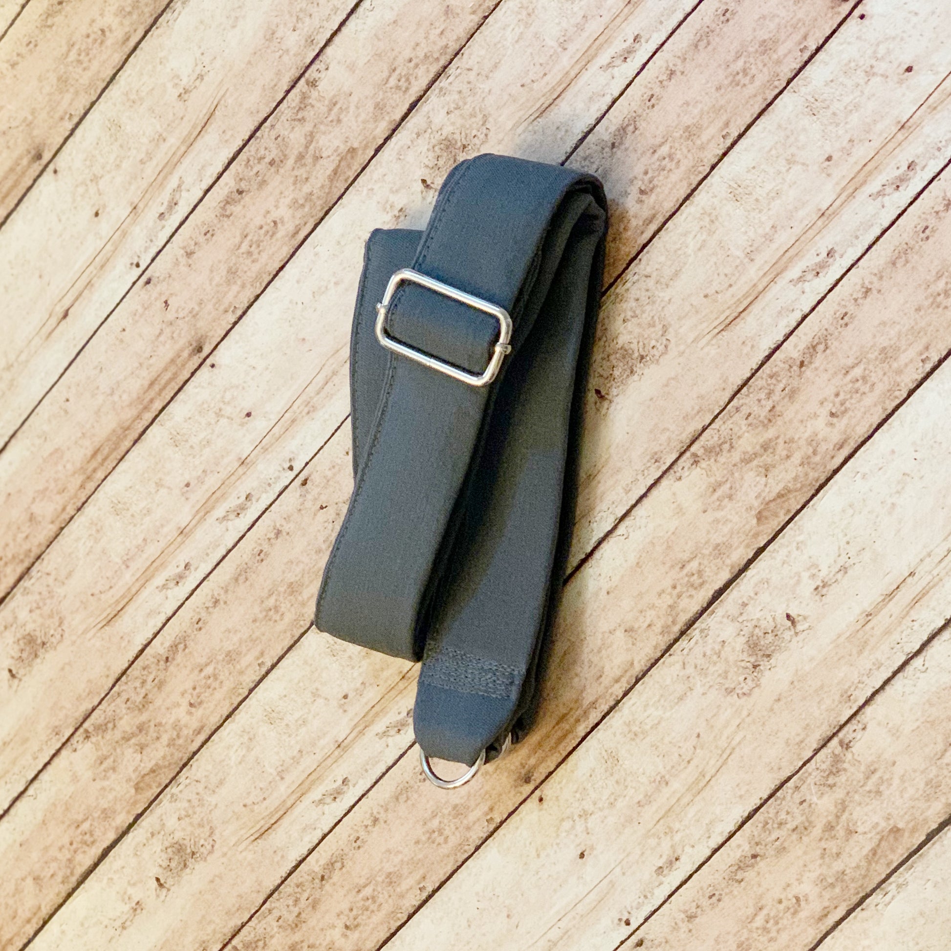 {Disclaimer: Due to the several layers sewn together to make this strap sturdy, the outer layer of material may get wrinkled when adjusting. To rectify this, simply press with an iron.}
