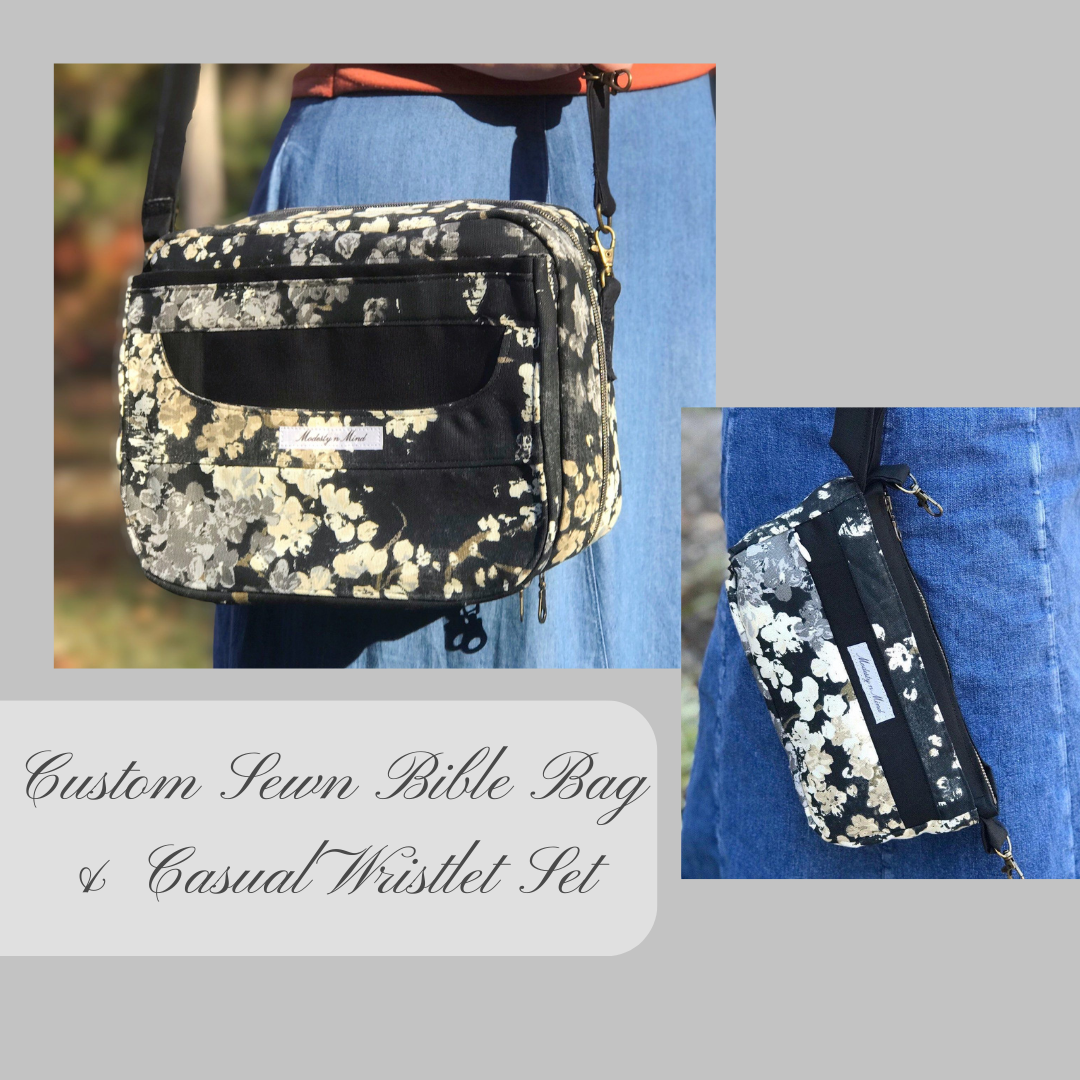 Frequently purchased together, MnM's Bible Bag and Casual Wristlet make a great set- whether you are purchasing for yourself or as a gift! This particular set is custom made to order from a black, beige & gray floral canvas print.