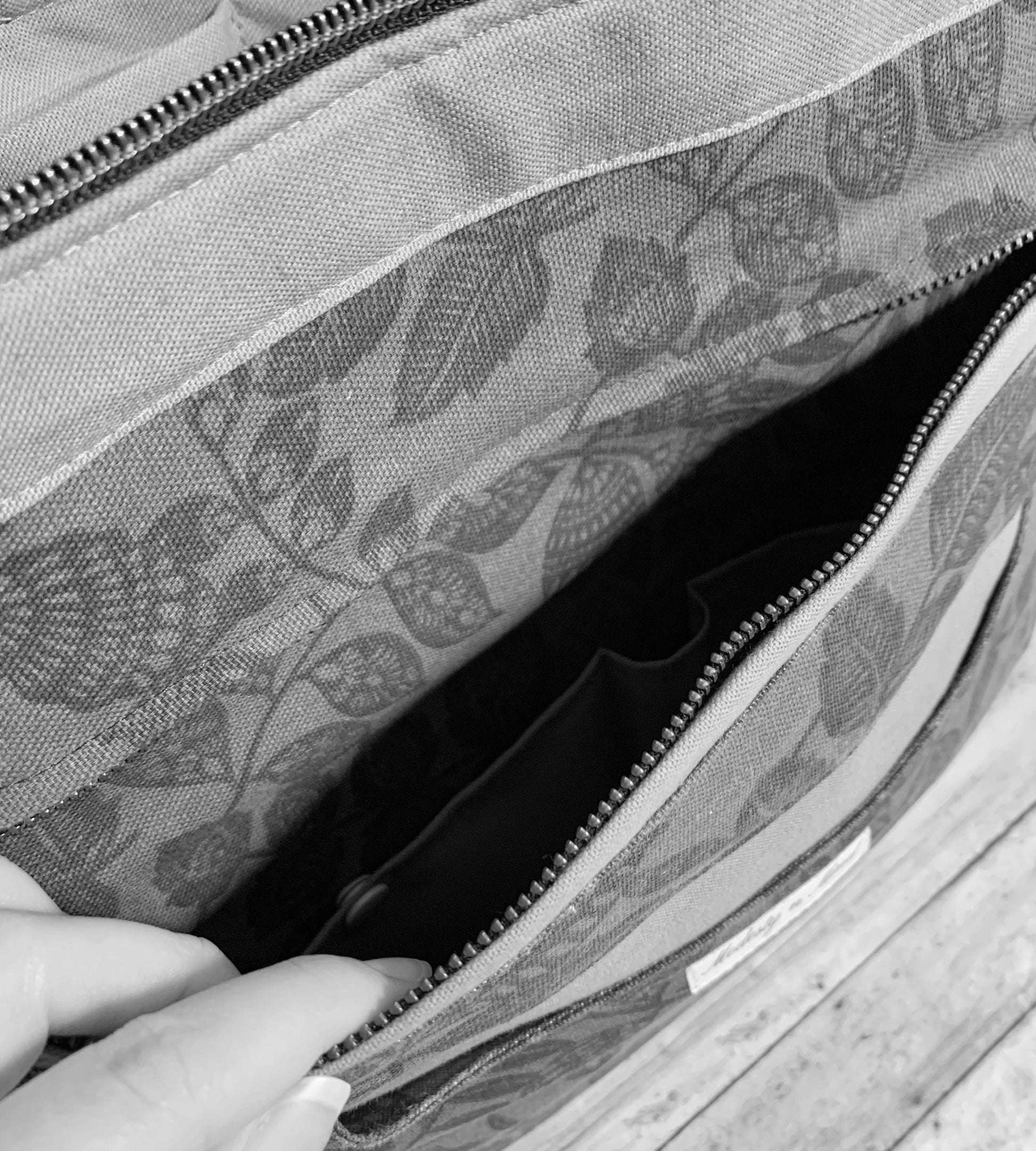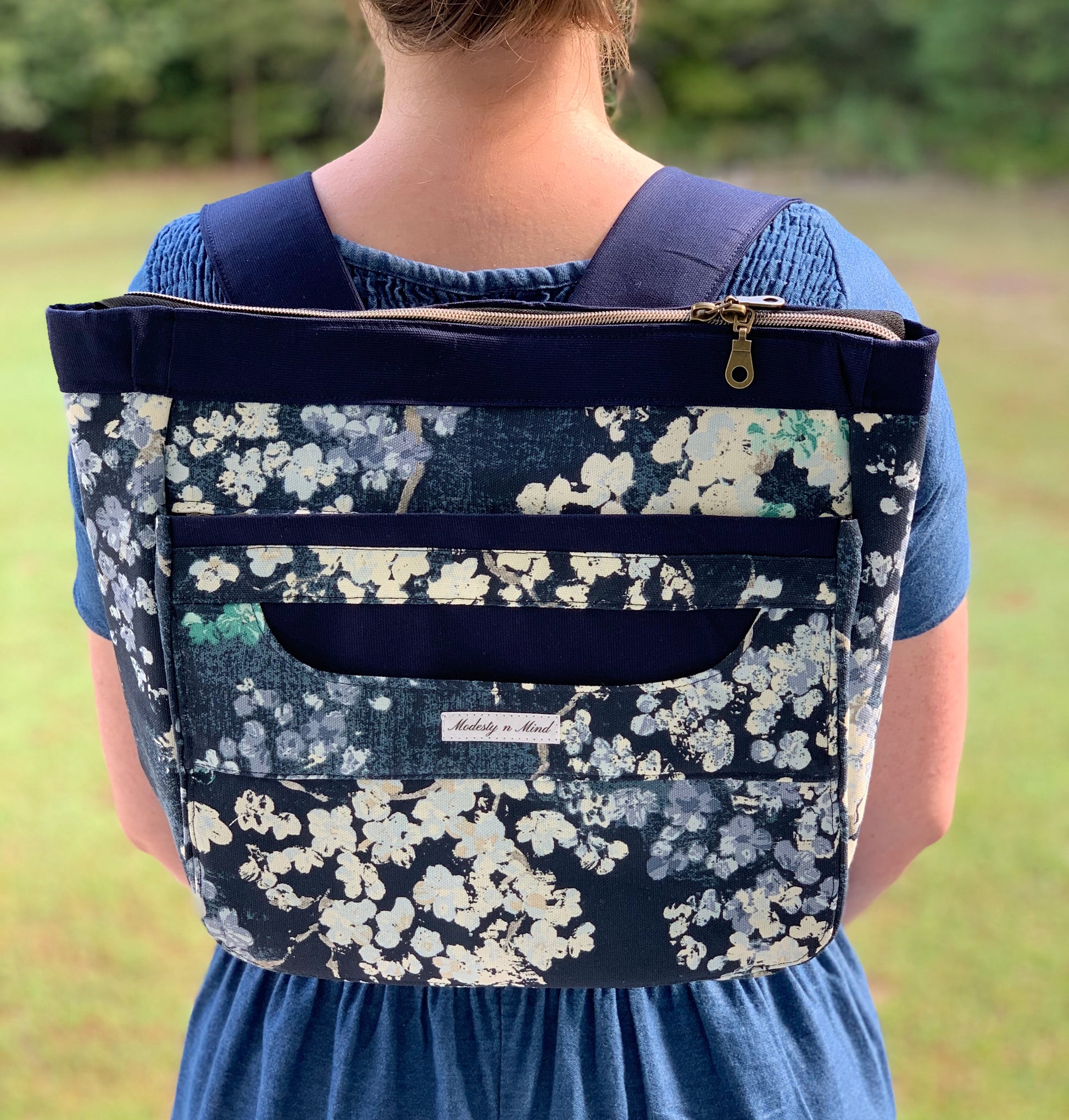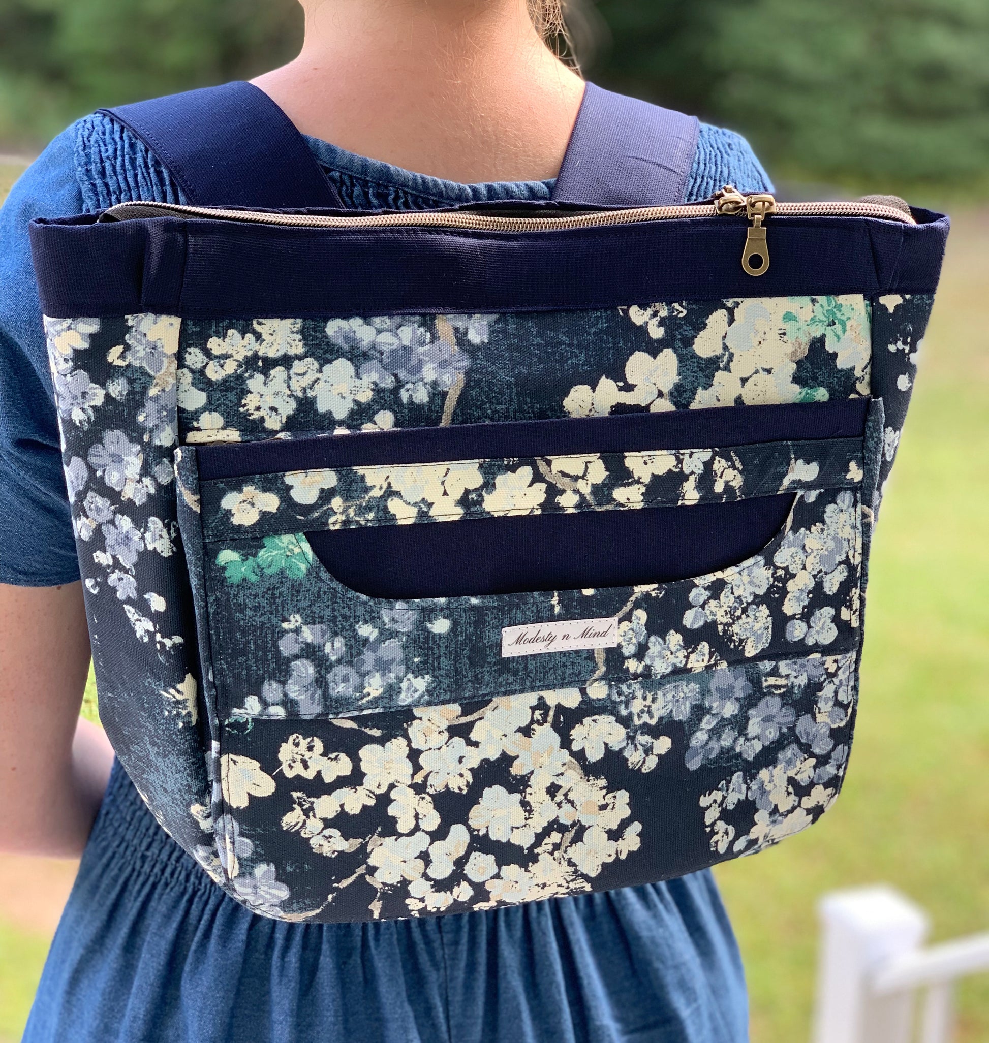 This particular Everyday Backpack is sewn from a Blue Floral & navy canvas.