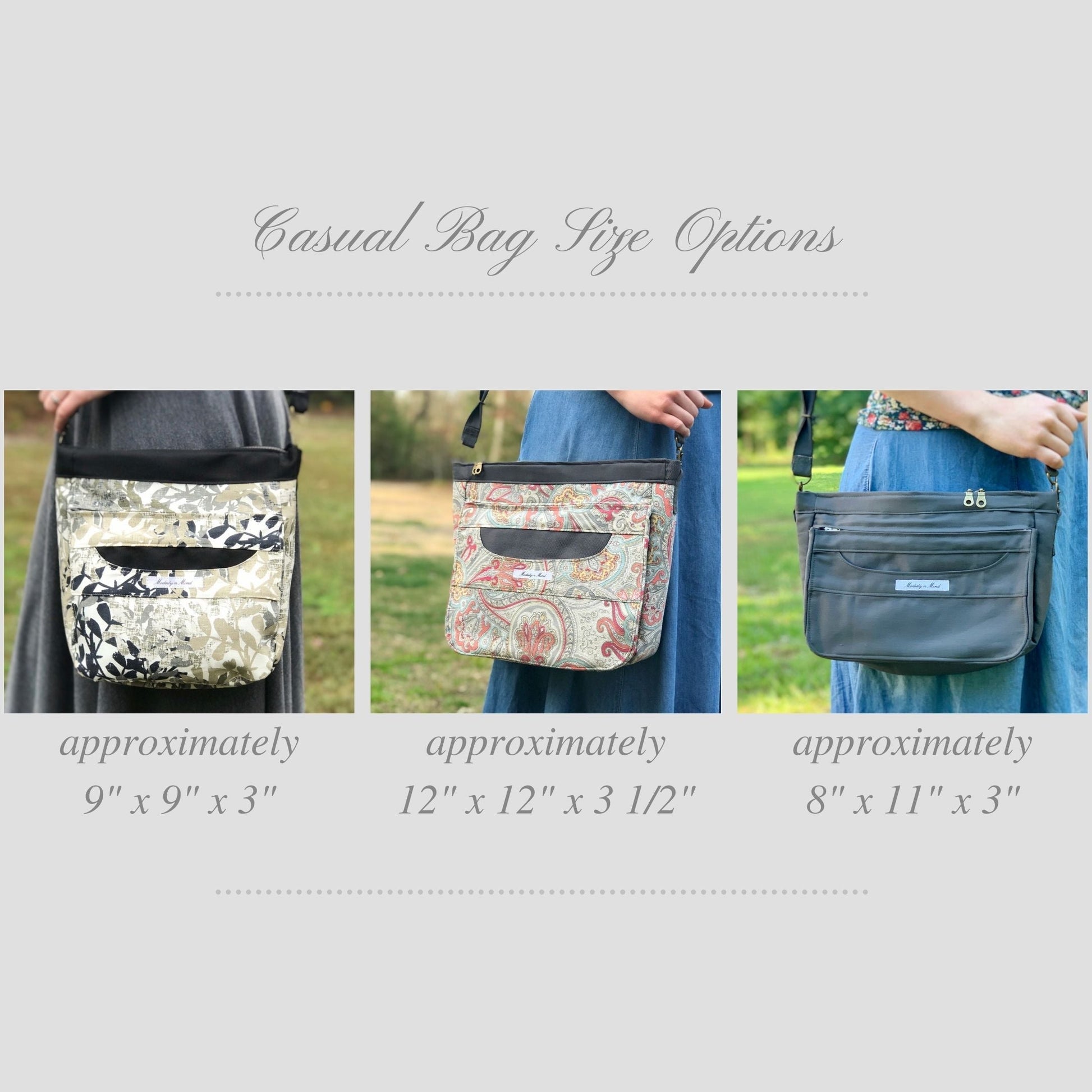 Approximately measuring 9"x9"x3", 8"x11"x3" or 12”x12”x3 1/2”, it can easily carry a small book & pens, crocheting project, or even a few diaper bag essentials. The pocket on the front is also handy for holding your phone where you can still hear it while running errands.