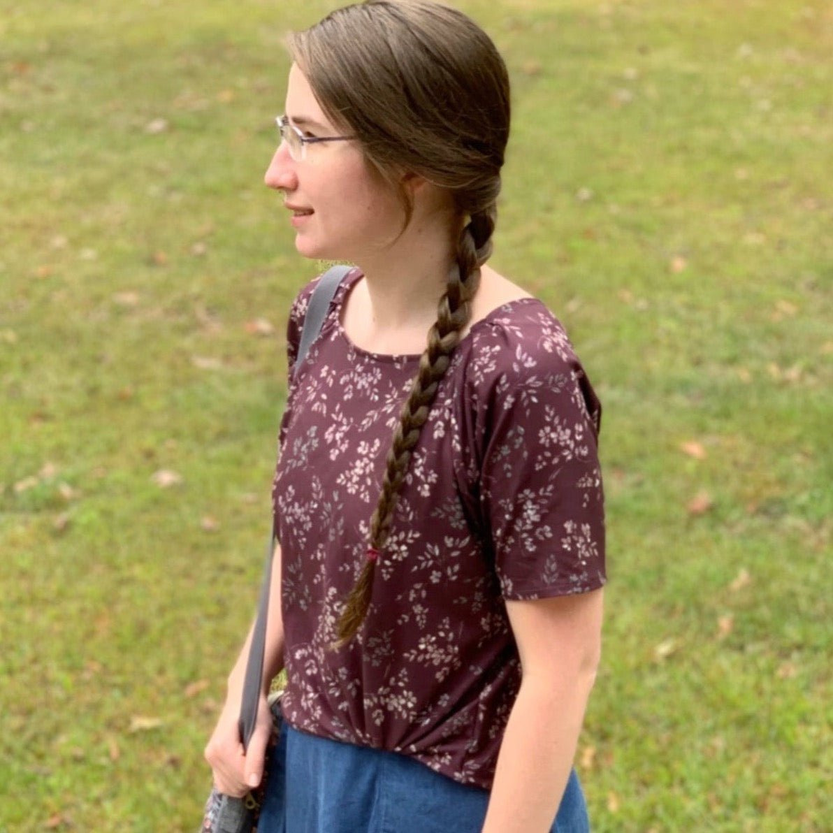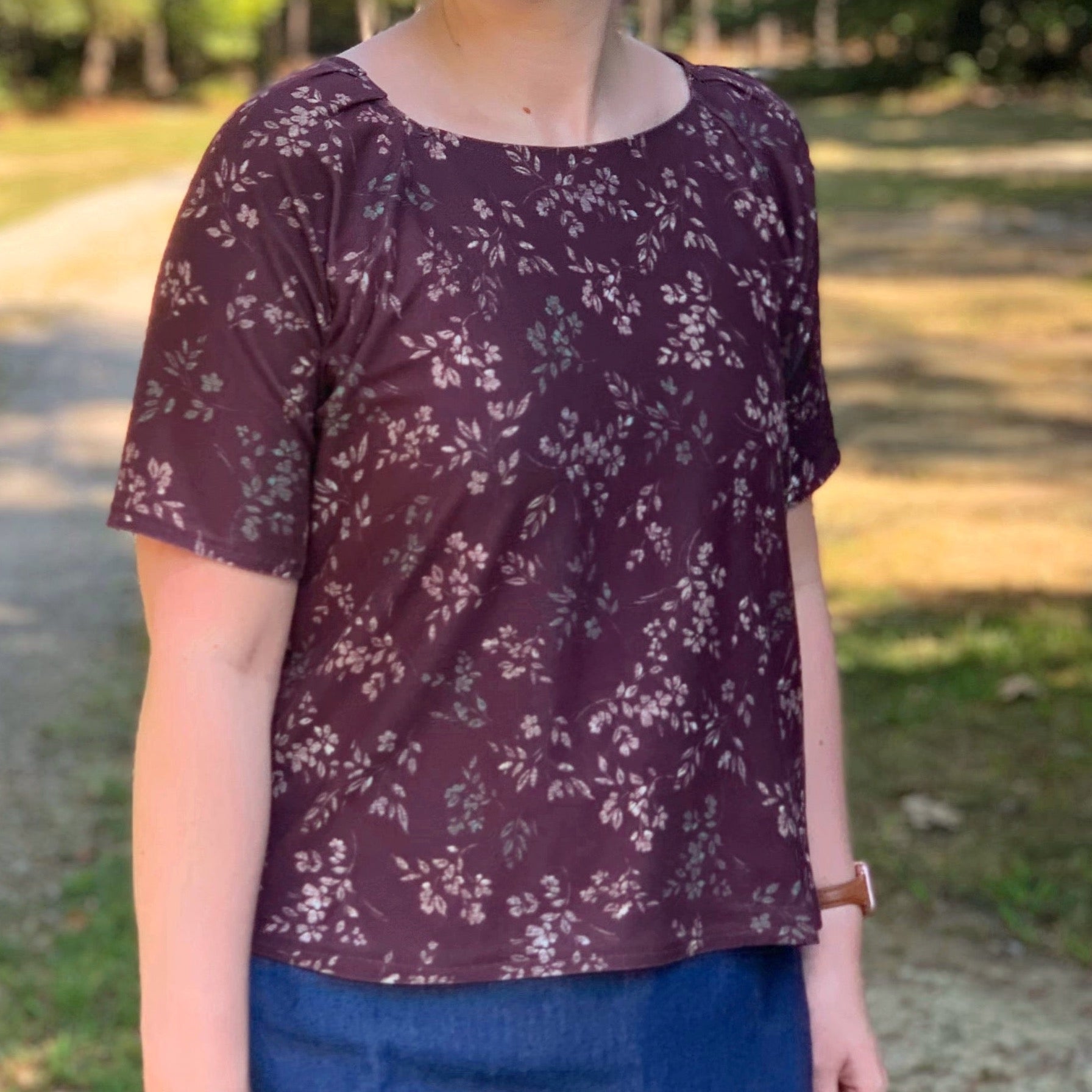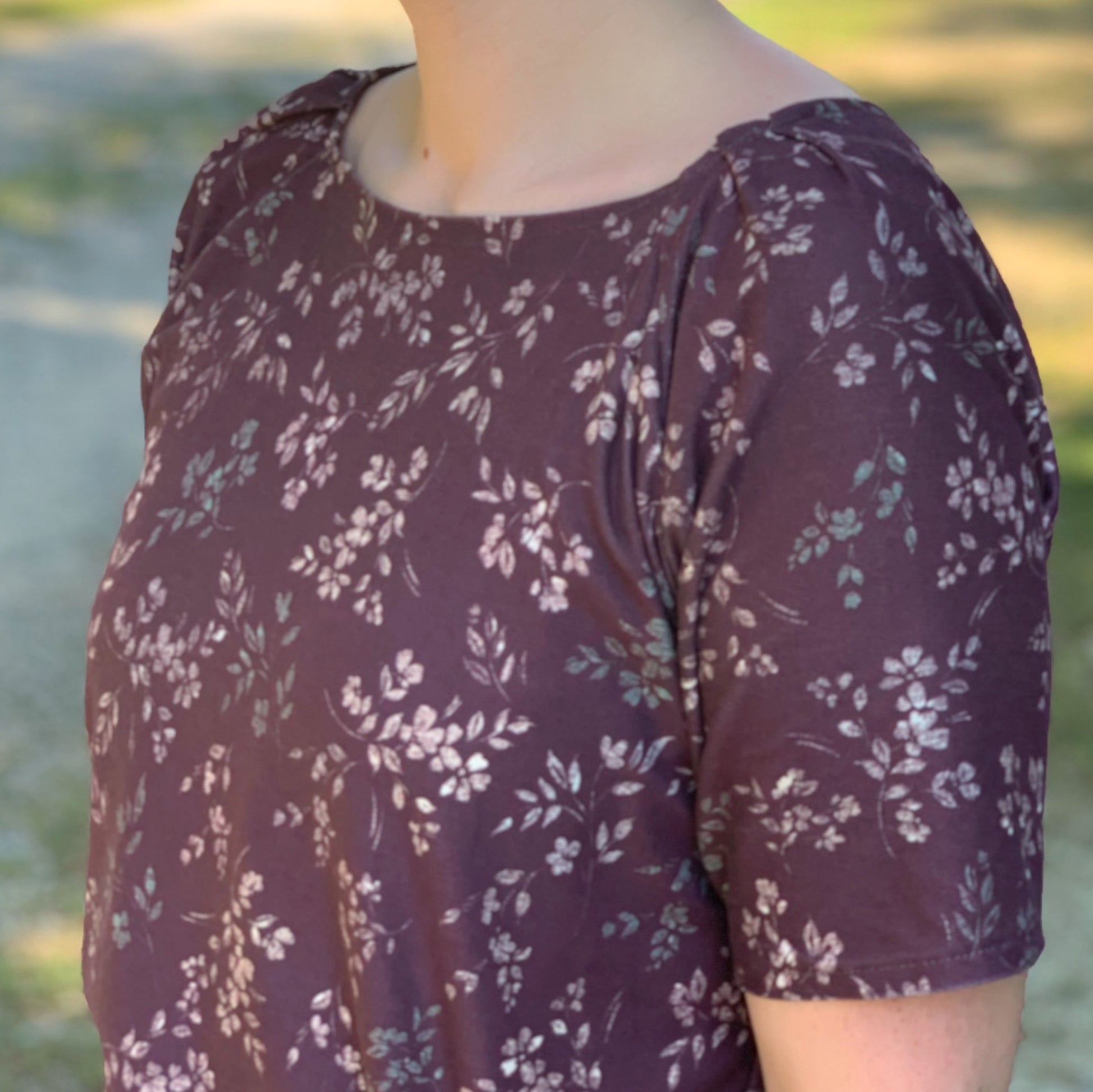 Sewn from a light/medium weight knit material, the little details around the neckline allow room for it to be very casual to somewhat dressy. Pair with your favorite jewelry, a scarf, or nothing at all!