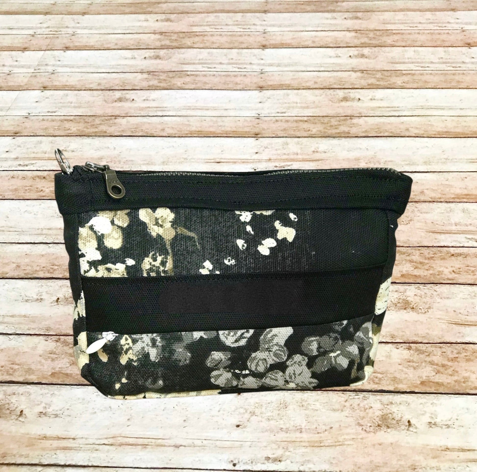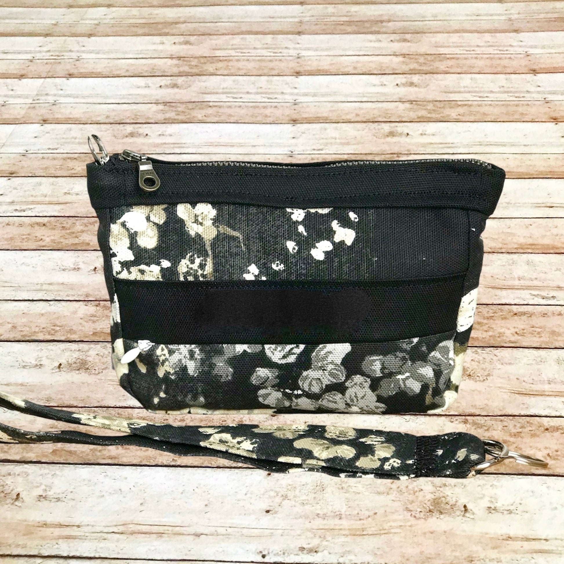Measuring approximately 4 1/2"x7"x1", this Mini Wristlet Wallet will be sewn from a beige/gray/black floral print + black solid. Available with or without a matching key fob.
