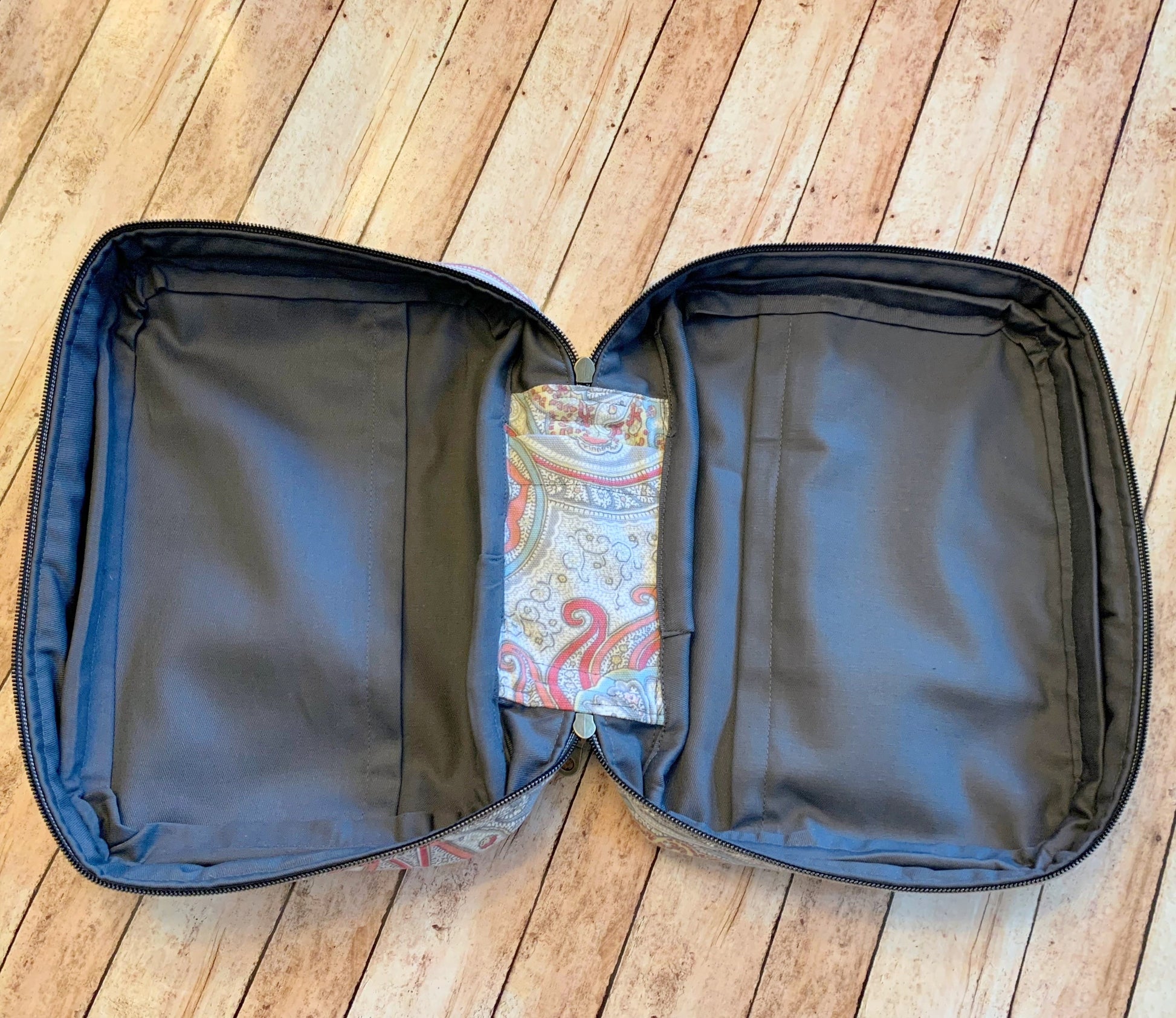Being the result of a customized Bible Bag order, this design has an invisible zippered pocket on the back & an upside down pocketed compartment complete with a keychain on the front. The main section of this cover is sewn to the measurements of your Bible & also has several places designated for pens/pencils.