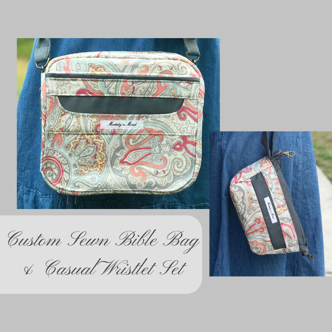 Frequently purchased together, MnM's Bible Bag and Casual Wristlet make a great set- whether you are purchasing for yourself or as a gift! This particular set is custom made to order from a popular coral & gray canvas print.