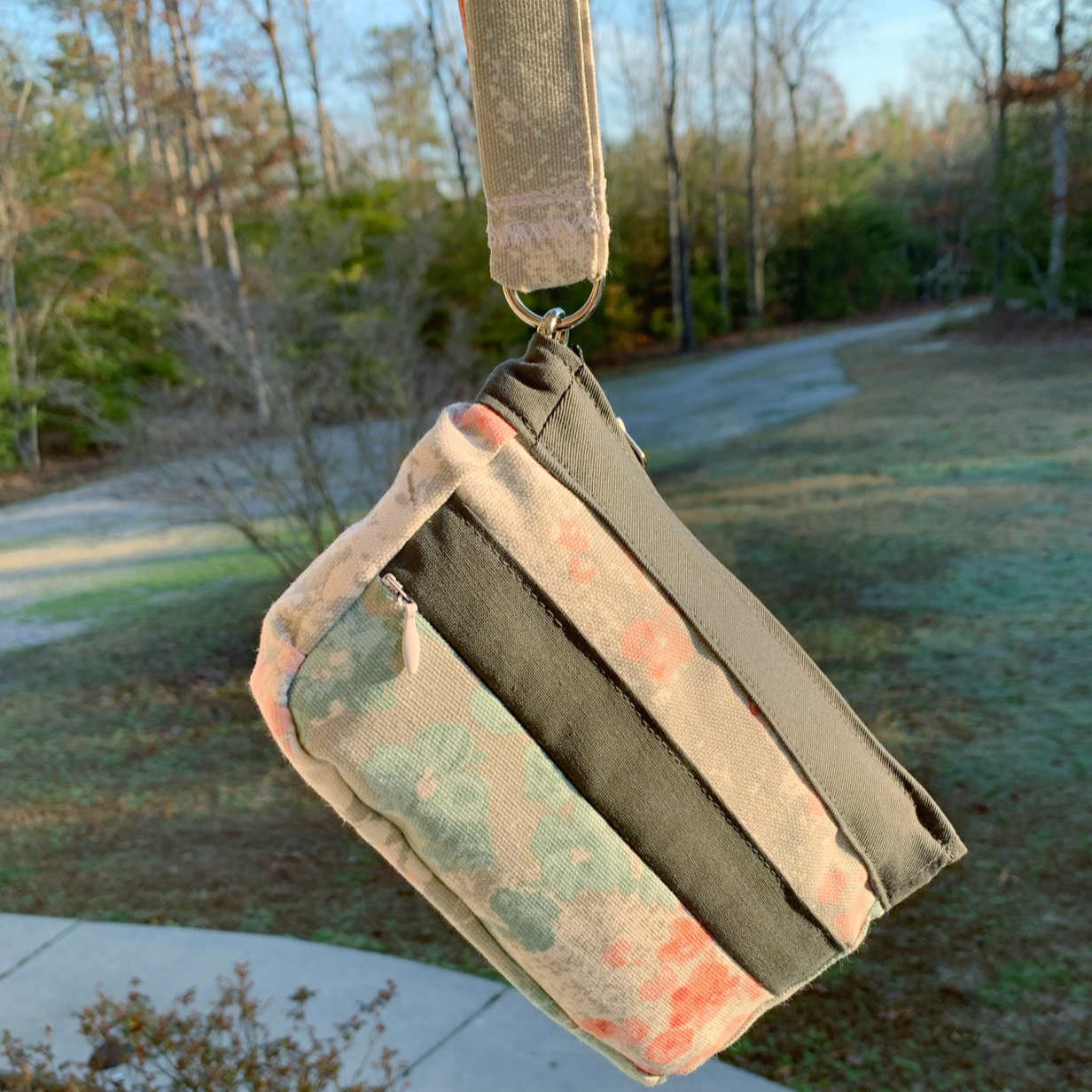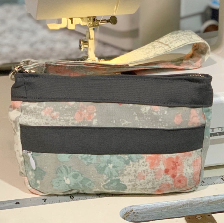 Measuring approximately 4 1/2"x7"x1", this Mini Wristlet Wallet will be sewn from a gray/pink/teal floral print + gray solid. Available with or without a matching key fob.