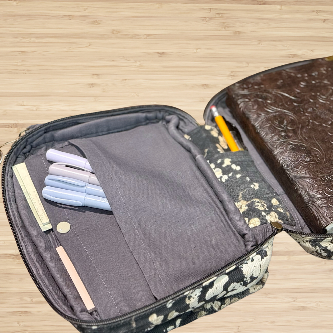 In addition to the main compartment, which is sewn to carry a planner (or Bible) and features two pockets to the left from where the book can be carried, this unique style also has: