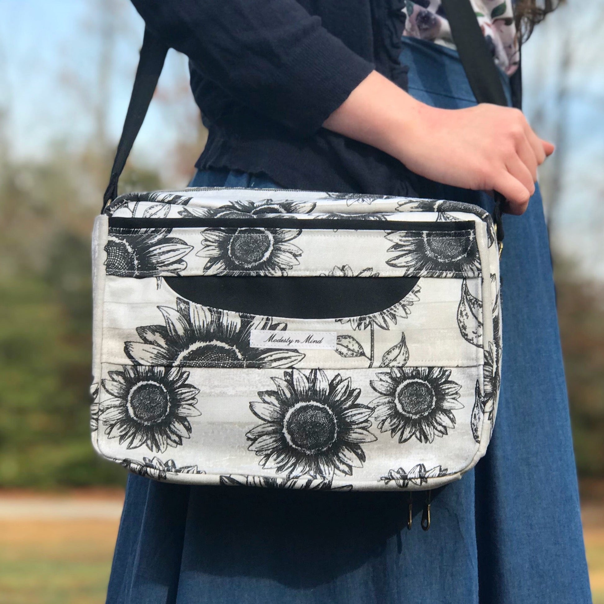 This particular Bible Bag is custom sewn from a black, off-white/white sunflower canvas print + black solid, off of the specifications submitted/selected in the customization box above (or sent to measurements@modestynmind.com)