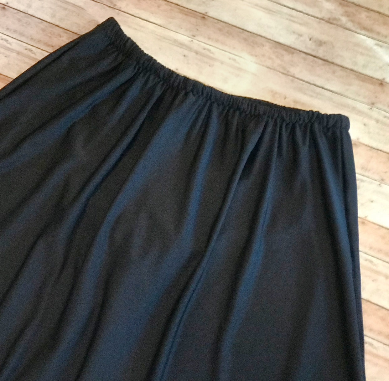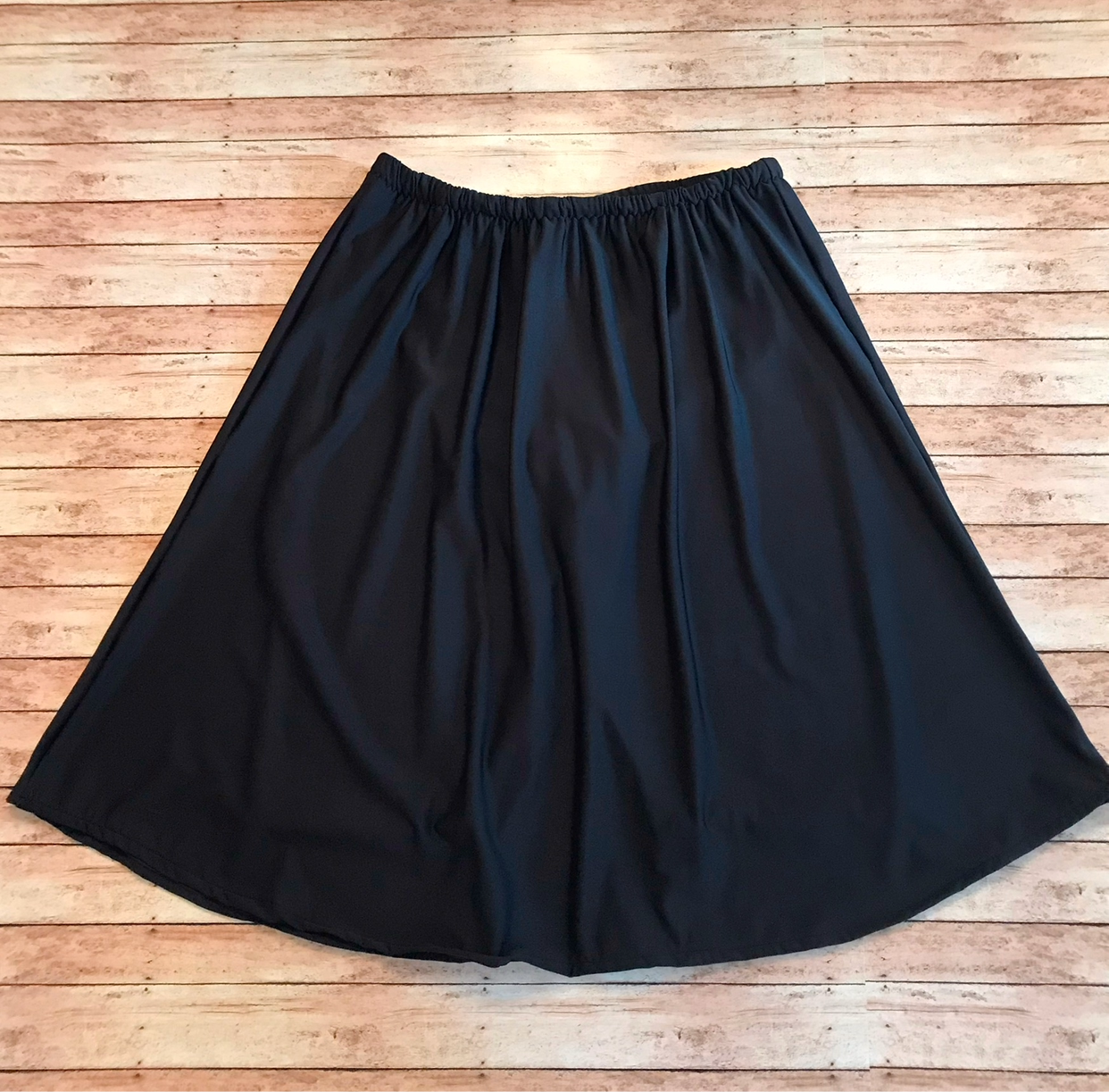 It has an elastic waist with an aline flare; making it great not only as an active skirt, but also as a cover up, or even as a casual skirt for warm summer days!